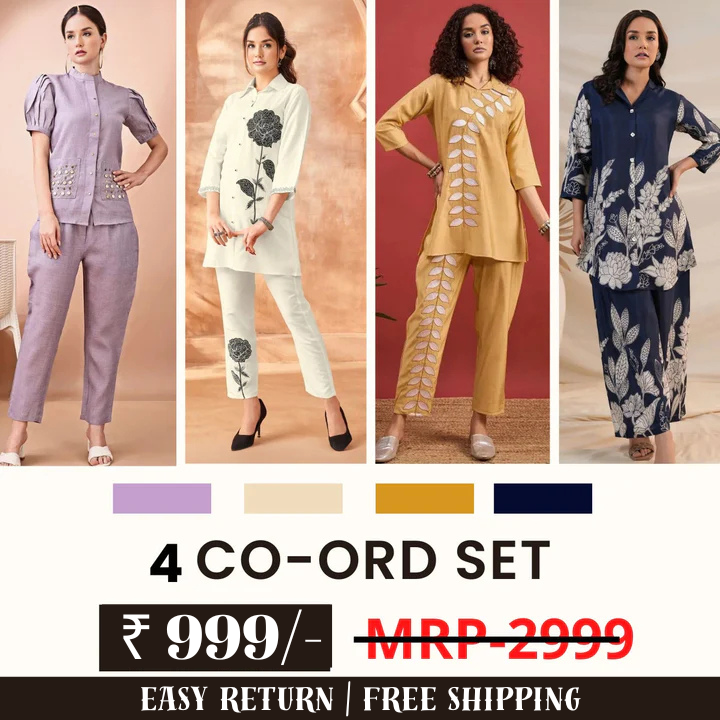 Bring efficiency and variety into your wardrobe with this four-set coordinated outfit collection crafted for women who want flexible styling and reliable comfort in one bundle. This pack includes four harmonized co-ord combinations engineered for breathable wear and adaptable usage — suitable for daily routines, travel plans, or casual outings.