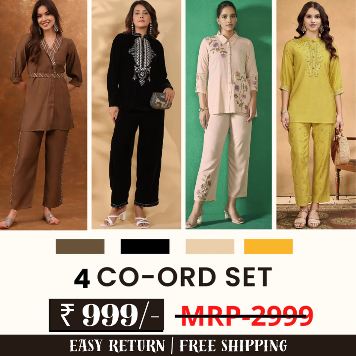 Expand your daily styling possibilities with this four-set coordinated outfit bundle designed for women who want variety, practicality, and convenience from one purchase. This pack delivers four harmonized co-ord combinations crafted for breathable comfort and flexible use — ideal for routine wear, travel styling, or relaxed outings.