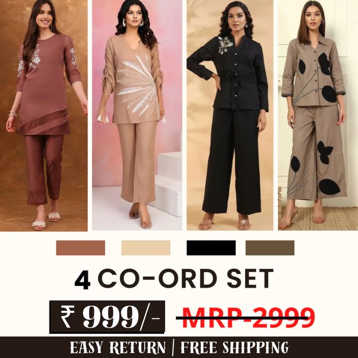 Boost your wardrobe flexibility with this four-set coordinated outfit bundle designed for women who want styling diversity and everyday practicality in one purchase. This pack delivers four ready-matched co-ord combinations engineered for breathable comfort and adaptable use — ideal for routine wear, travel styling, or casual outings.